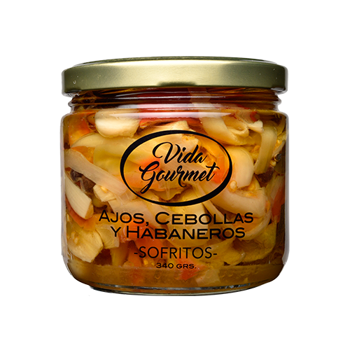 Ajos, Cebollas, Chile Habanero Aceite Vegetal, Especias, Sal Yodada, Benzoato de Sodio (como conservador).